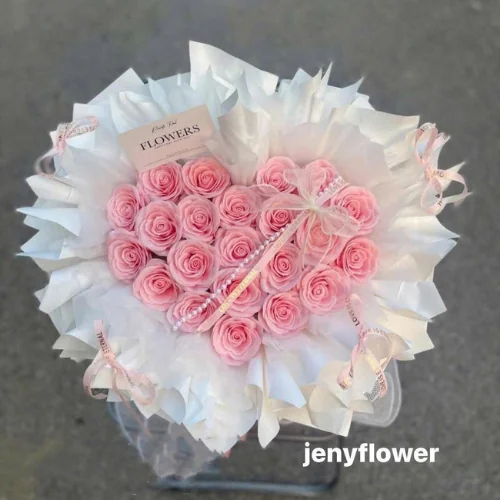 Điểm nhấn làm nên sự khác biệt của bó hoa này chính là thiết kế dạng trái tim. Hình ảnh trái tim không chỉ là biểu tượng vượt thời gian của tình yêu mà còn là lời khẳng định mạnh mẽ nhất về cảm xúc chân thành, sự gắn bó và sự quan tâm sâu sắc. Mỗi bông hoa được sắp xếp tỉ mỉ, khéo léo để tạo thành hình trái tim hoàn mỹ, thể hiện sự công phu và tâm huyết của người thợ cắm hoa.